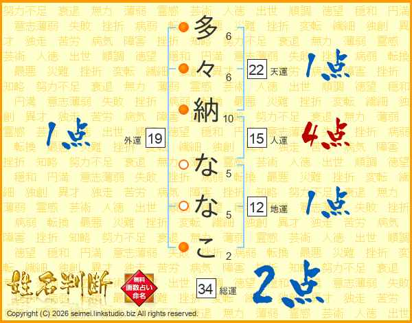 生活面を象徴する運勢です。外部から受ける影響力を表し、結婚運、家庭運や職場、環境への順応性を表します。総運から人運を引いた画数。姓や名が1文字の場合を除く。