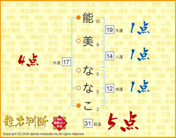 能(10画)美(9画) な(5画)な(5画)こ(2画)