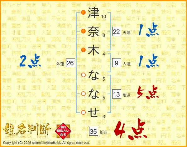 津(10画)奈(8画)木(4画) な(5画)な(5画)せ(3画)