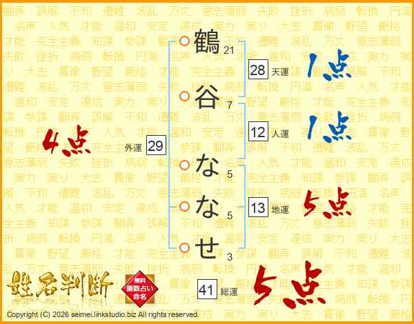 鶴(21画)谷(7画) な(5画)な(5画)せ(3画)