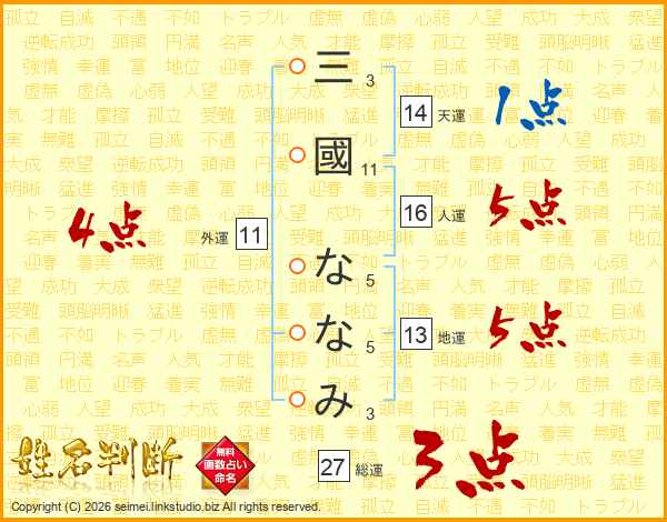 生活面を象徴する運勢です。外部から受ける影響力を表し、結婚運、家庭運や職場、環境への順応性を表します。総運から人運を引いた画数。姓や名が1文字の場合を除く。