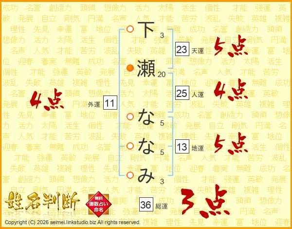 下瀬ななみさんの天運は23画の5点!