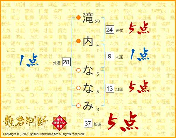 滝(20画)内(4画) な(5画)な(5画)み(3画)