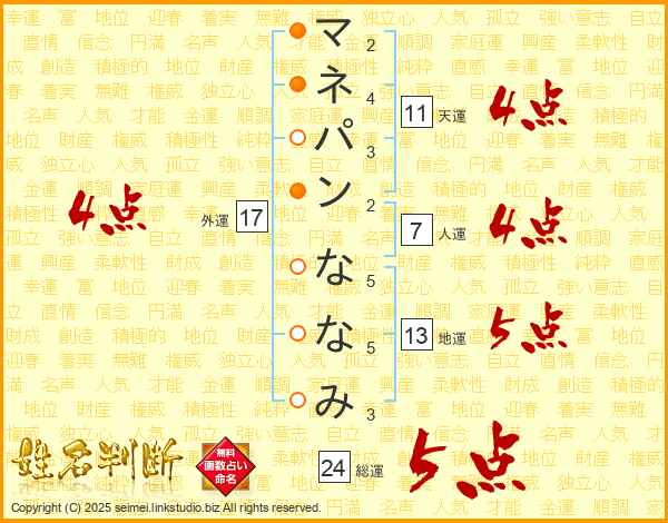 マ(2画)ネ(4画)パ(3画)ン(2画) な(5画)な(5画)み(3画)