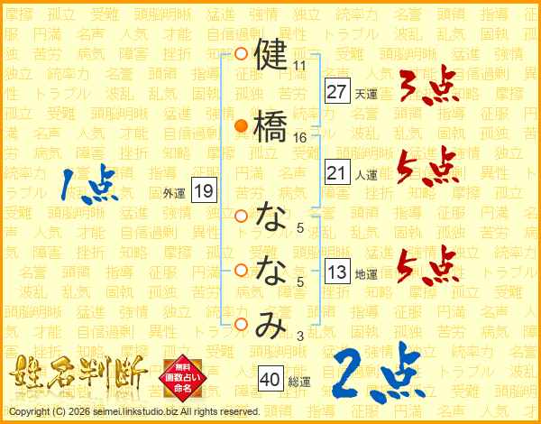 健(11画)橋(16画) な(5画)な(5画)み(3画)