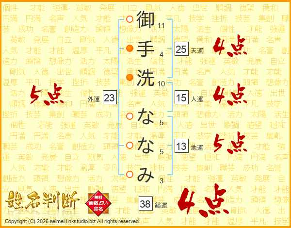 生活面を象徴する運勢です。外部から受ける影響力を表し、結婚運、家庭運や職場、環境への順応性を表します。総運から人運を引いた画数。姓や名が1文字の場合を除く。