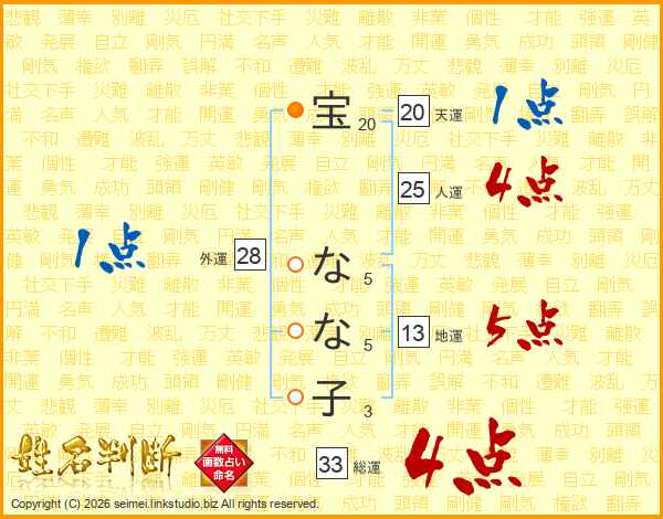 生活面を象徴する運勢です。外部から受ける影響力を表し、結婚運、家庭運や職場、環境への順応性を表します。総運から人運を引いた画数。姓や名が1文字の場合を除く。