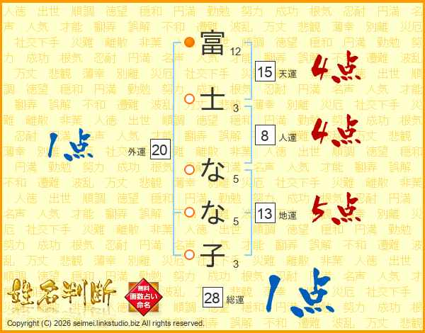 富(12画)士(3画) な(5画)な(5画)子(3画)