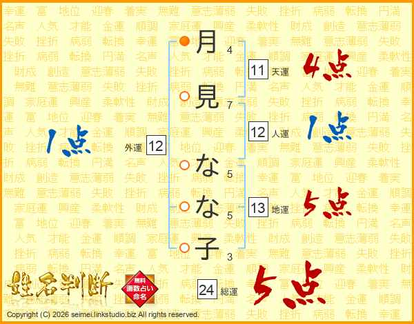 月(4画)見(7画) な(5画)な(5画)子(3画)