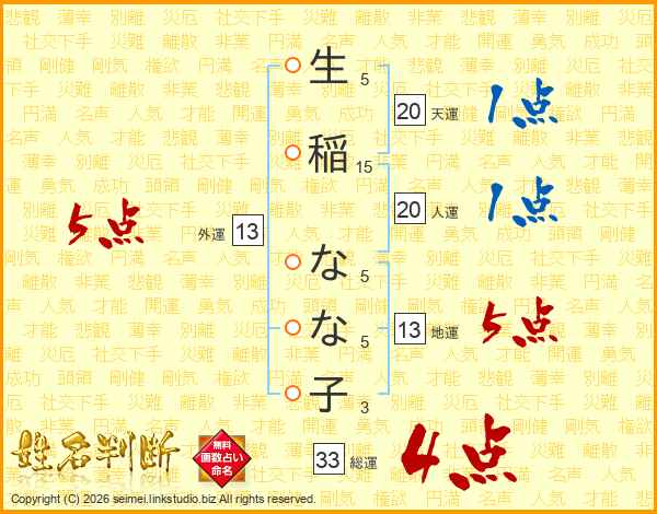 生(5画)稲(15画) な(5画)な(5画)子(3画)