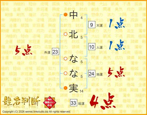 中(4画)北(5画) な(5画)な(5画)実(14画)
