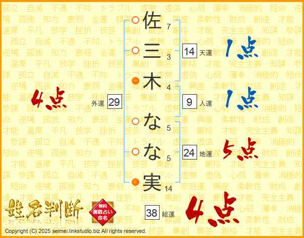 佐(7画)三(3画)木(4画) な(5画)な(5画)実(14画)