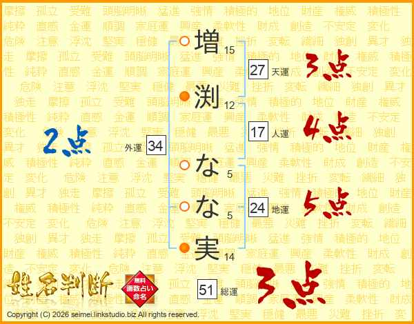 増(15画)渕(12画) な(5画)な(5画)実(14画)