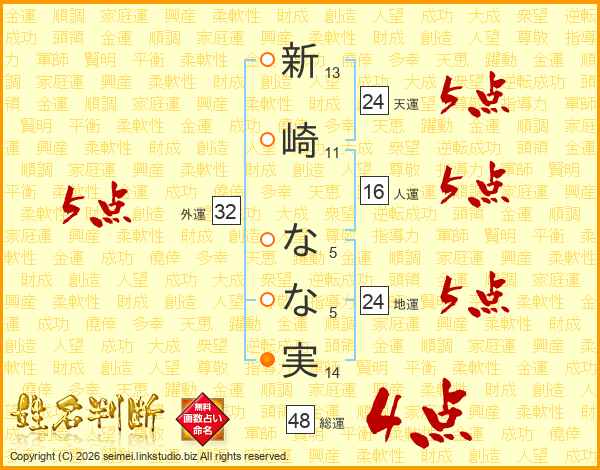 新(13画)崎(11画) な(5画)な(5画)実(14画)