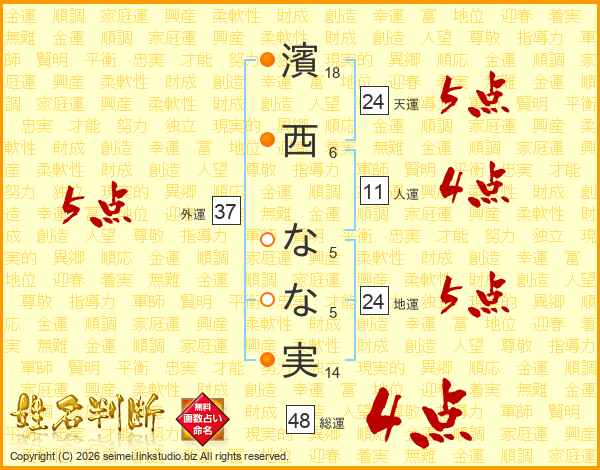 濱(18画)西(6画) な(5画)な(5画)実(14画)
