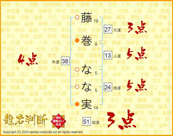 藤(19画)巻(8画) な(5画)な(5画)実(14画)
