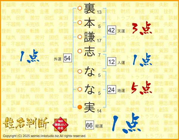 裏(13画)本(5画)謙(17画)志(7画) な(5画)な(5画)実(14画)