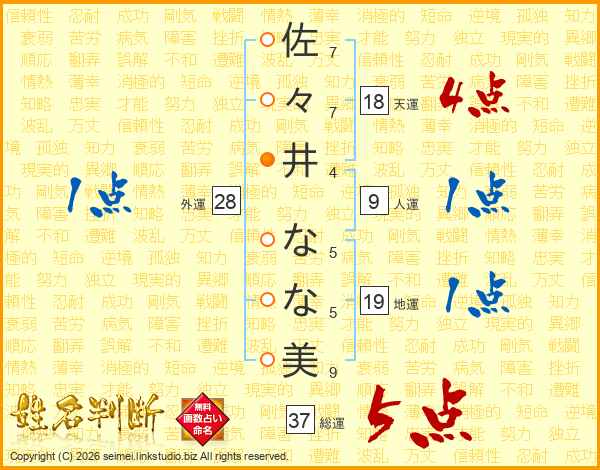 佐(7画)々(7画)井(4画) な(5画)な(5画)美(9画)