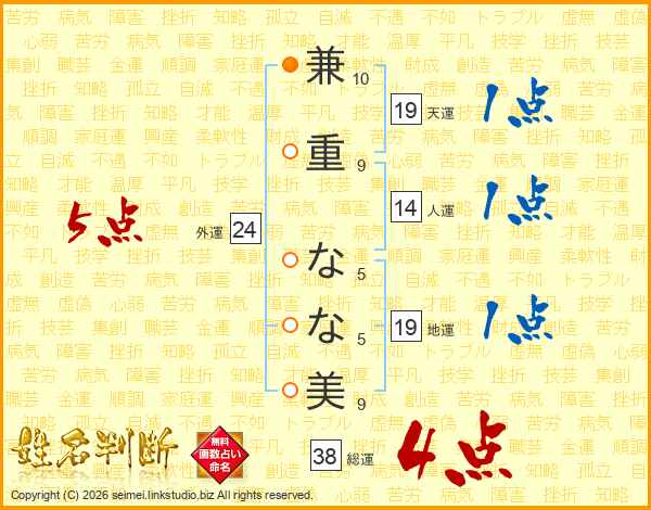 兼重なな美さんの総運は38画の4点!