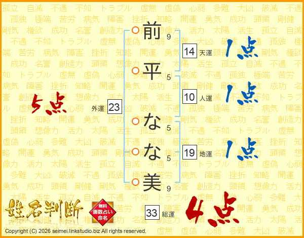 前(9画)平(5画) な(5画)な(5画)美(9画)