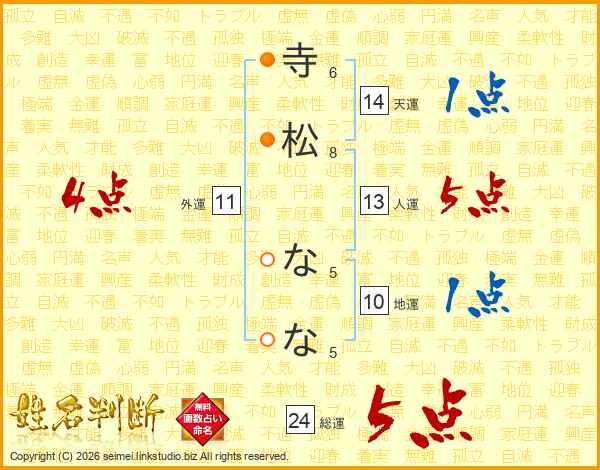 生活面を象徴する運勢です。外部から受ける影響力を表し、結婚運、家庭運や職場、環境への順応性を表します。総運から人運を引いた画数。姓や名が1文字の場合を除く。