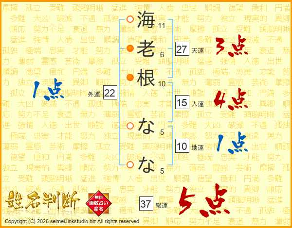 海(11画)老(6画)根(10画) な(5画)な(5画)