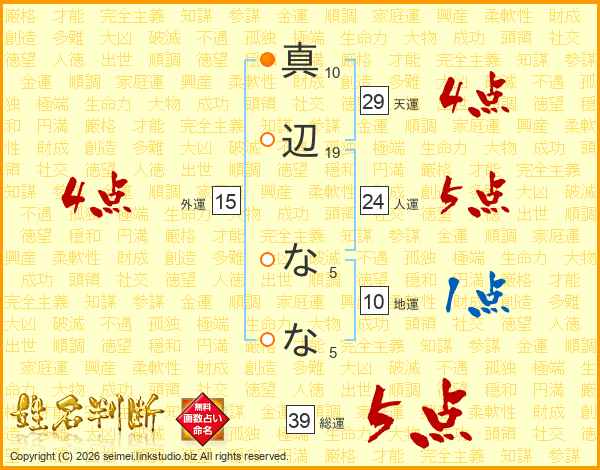 生活面を象徴する運勢です。外部から受ける影響力を表し、結婚運、家庭運や職場、環境への順応性を表します。総運から人運を引いた画数。姓や名が1文字の場合を除く。