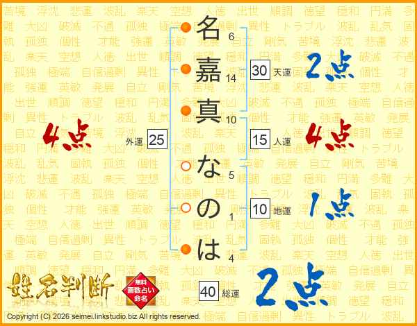名(6画)嘉(14画)真(10画) な(5画)の(1画)は(4画)