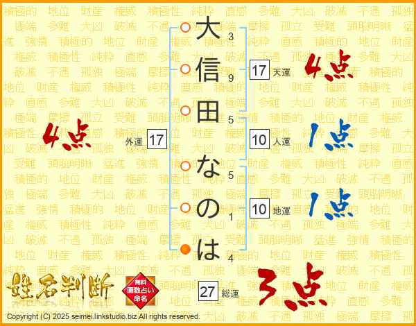 大(3画)信(9画)田(5画) な(5画)の(1画)は(4画)