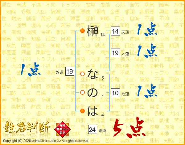 生活面を象徴する運勢です。外部から受ける影響力を表し、結婚運、家庭運や職場、環境への順応性を表します。総運から人運を引いた画数。姓や名が1文字の場合を除く。