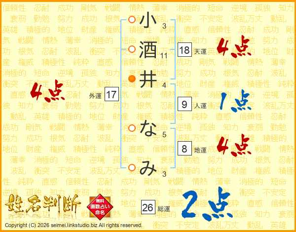 小酒井なみさんの総運は26画の2点!