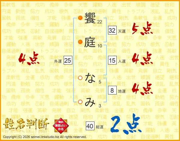 生活面を象徴する運勢です。外部から受ける影響力を表し、結婚運、家庭運や職場、環境への順応性を表します。総運から人運を引いた画数。姓や名が1文字の場合を除く。