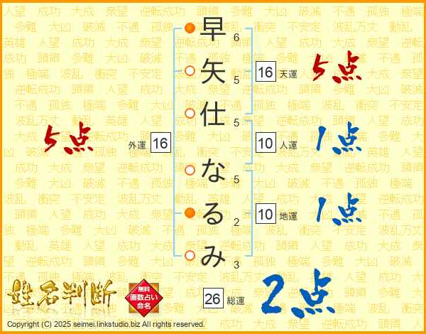 早(6画)矢(5画)仕(5画) な(5画)る(2画)み(3画)
