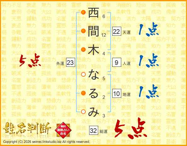 西間木なるみさんの総運は32画の5点!