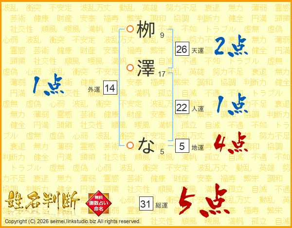 栁澤なさんの天運は26画の2点!