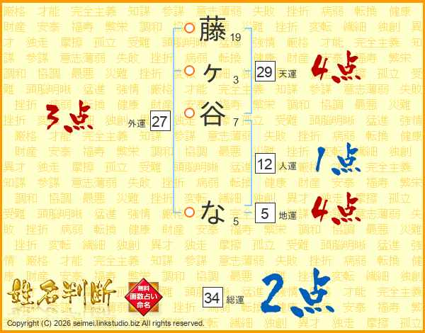 藤(19画)ヶ(3画)谷(7画) な(5画)