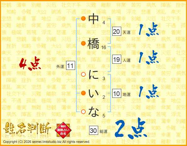 画数の奇数(○陽)と偶数(●陰)の配列で吉凶を占います。どちらかにかたよる名前は大凶名で避ける必要があります。画数の奇数偶数。