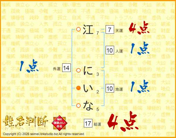 生活面を象徴する運勢です。外部から受ける影響力を表し、結婚運、家庭運や職場、環境への順応性を表します。総運から人運を引いた画数。姓や名が1文字の場合を除く。