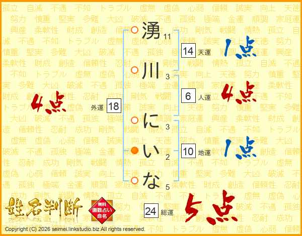 生活面を象徴する運勢です。外部から受ける影響力を表し、結婚運、家庭運や職場、環境への順応性を表します。総運から人運を引いた画数。姓や名が1文字の場合を除く。