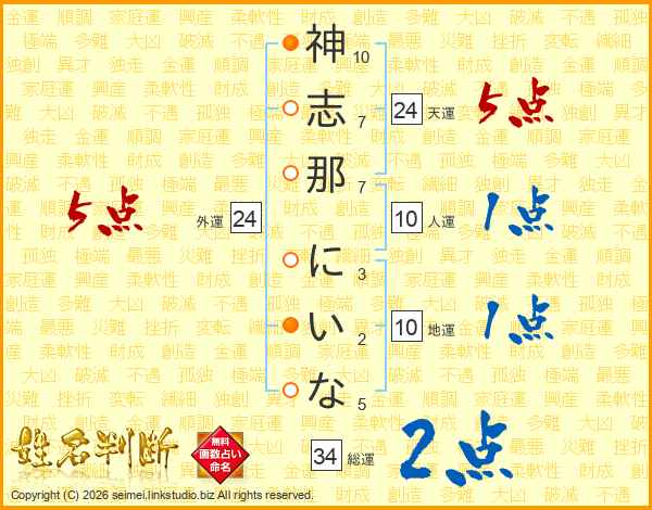 神(10画)志(7画)那(7画) に(3画)い(2画)な(5画)