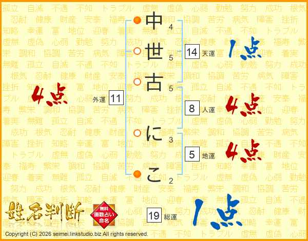 中(4画)世(5画)古(5画) に(3画)こ(2画)