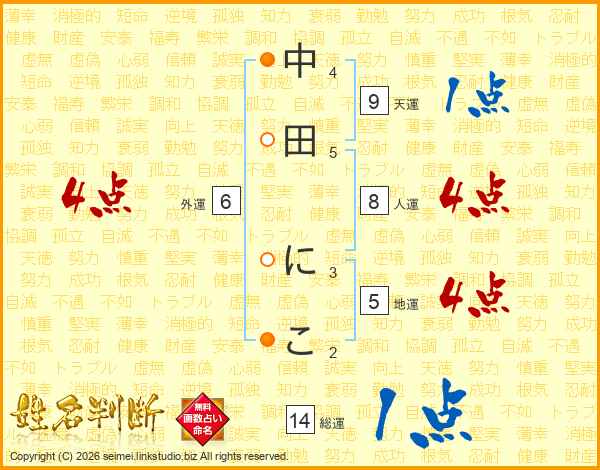 生活面を象徴する運勢です。外部から受ける影響力を表し、結婚運、家庭運や職場、環境への順応性を表します。総運から人運を引いた画数。姓や名が1文字の場合を除く。