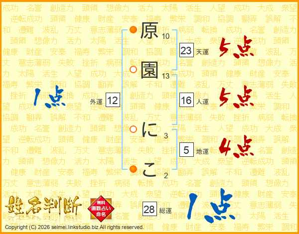 生活面を象徴する運勢です。外部から受ける影響力を表し、結婚運、家庭運や職場、環境への順応性を表します。総運から人運を引いた画数。姓や名が1文字の場合を除く。