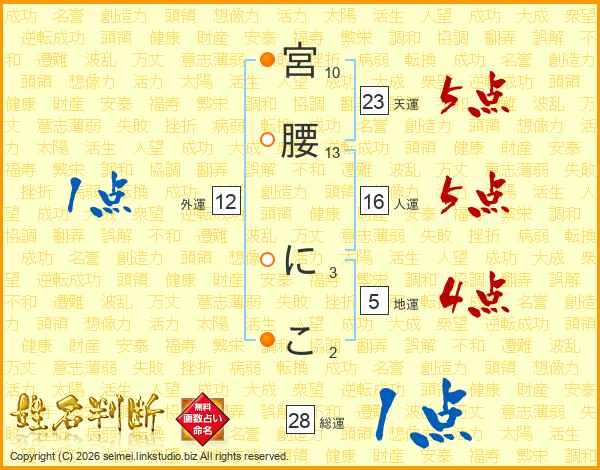 宮腰にこさんの天運は23画の5点!