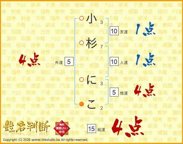 生活面を象徴する運勢です。外部から受ける影響力を表し、結婚運、家庭運や職場、環境への順応性を表します。総運から人運を引いた画数。姓や名が1文字の場合を除く。