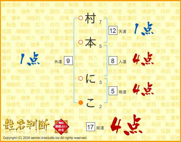 生活面を象徴する運勢です。外部から受ける影響力を表し、結婚運、家庭運や職場、環境への順応性を表します。総運から人運を引いた画数。姓や名が1文字の場合を除く。