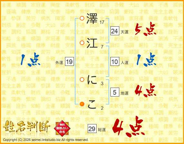 生活面を象徴する運勢です。外部から受ける影響力を表し、結婚運、家庭運や職場、環境への順応性を表します。総運から人運を引いた画数。姓や名が1文字の場合を除く。