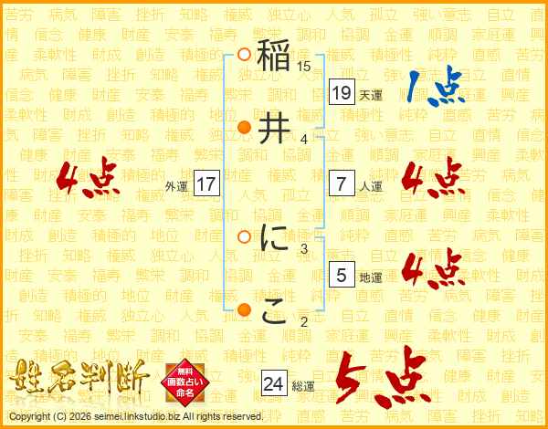 生活面を象徴する運勢です。外部から受ける影響力を表し、結婚運、家庭運や職場、環境への順応性を表します。総運から人運を引いた画数。姓や名が1文字の場合を除く。