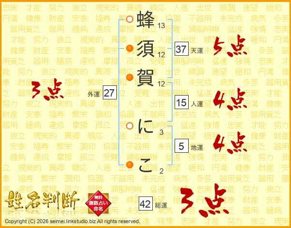 蜂(13画)須(12画)賀(12画) に(3画)こ(2画)