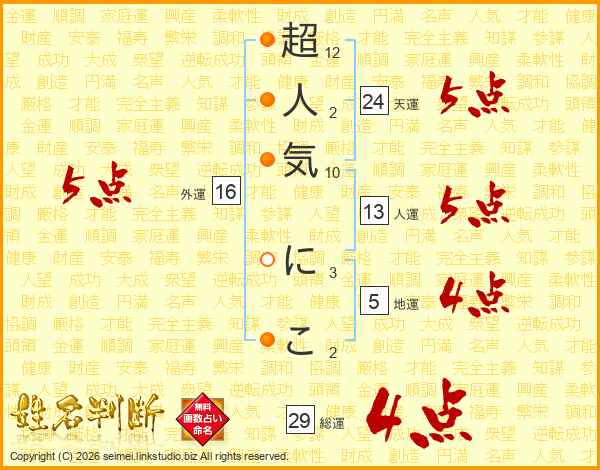 超(12画)人(2画)気(10画) に(3画)こ(2画)